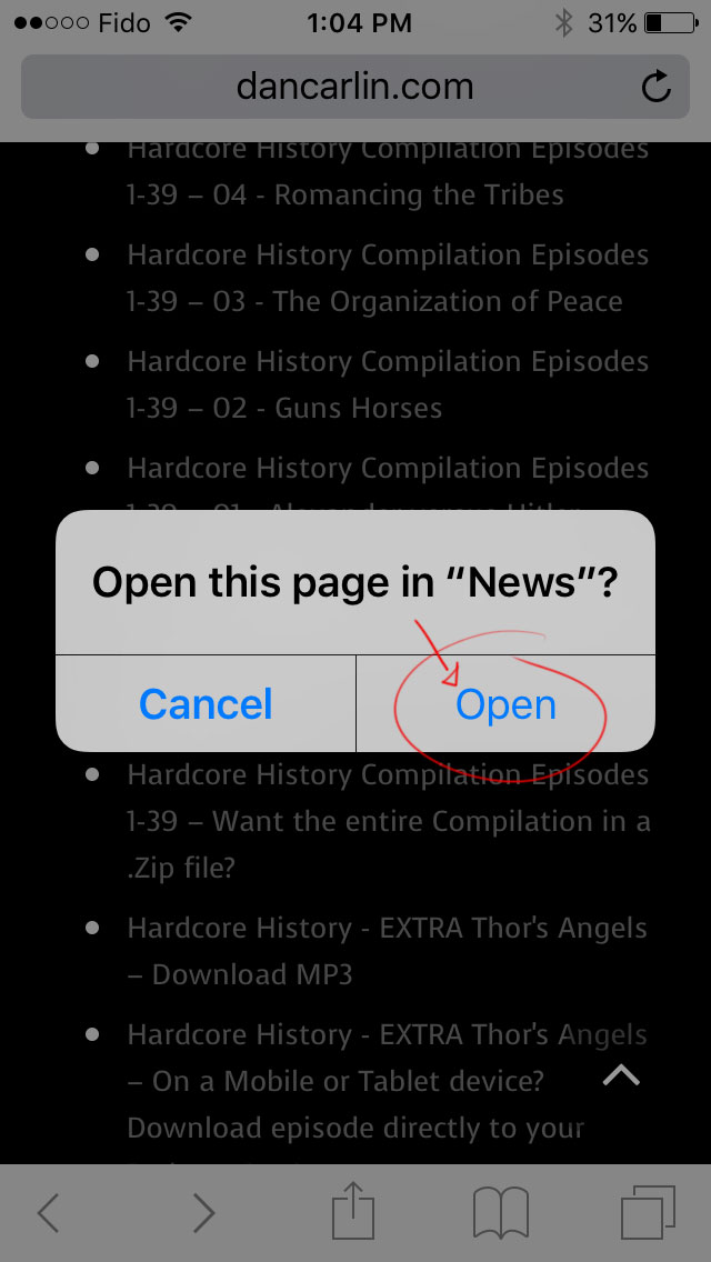 When the order is finished, please log into dancarlin.com with the iOS device, like an iPhone or iPad, using the Safari Browser. Once logged in you will be redirected to the “My Account” page in the Merchandise menu which will have a link to the “Orders” page with each individual order and a link to the “Downloads” page which will have the MP3 files and links. The mobile link for the history episode, series, or compilation will be in the download page as well as the page associated with the order. The mobile link will redirect through the news app which “Open” should be selected