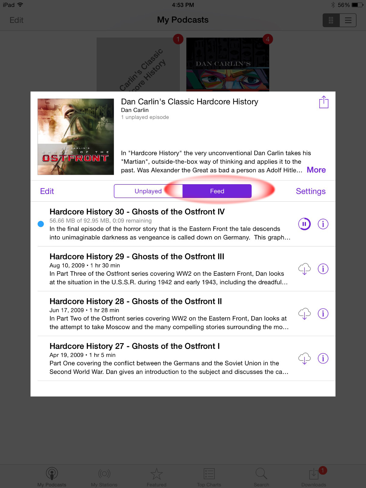 If you purchased the 1-39 compilation or one of the multi part series, please make sure to be in the “Feed” section (not unplayed) to display all the available shows.