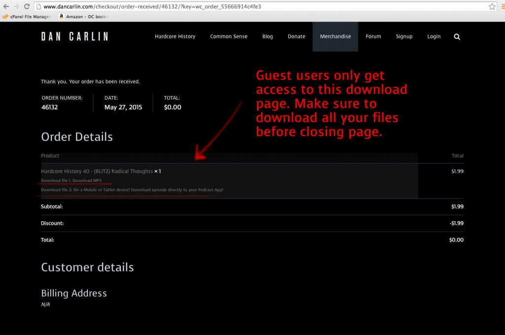 After you’ve purchased a show(s) you’ll see the order details page which will have the links to the MP3 files as well as mobile links associated with the history episodes.