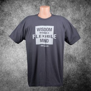 This “Wisdom Requires a Flexible Mind” shirt is screen printed with discharge ink which is formulated to deactivate (remove) dyes used on the fabric.